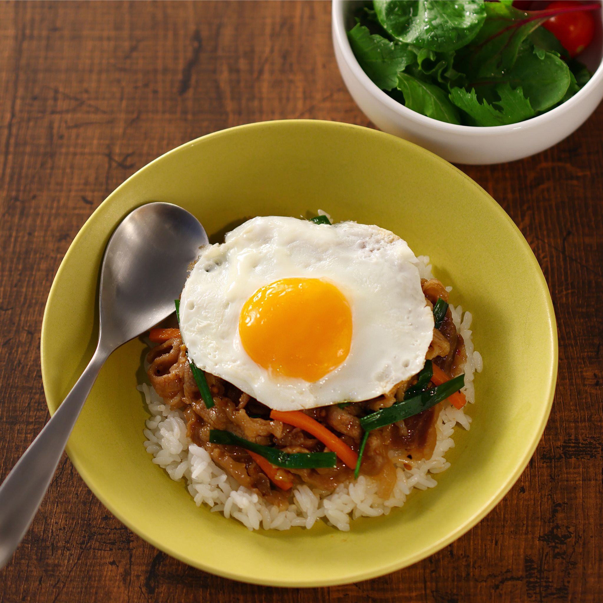 このお肉を玉ねぎやにんじん、にらなど好みの野菜と炒めて、ごはんにのっけて、目玉焼きをon!