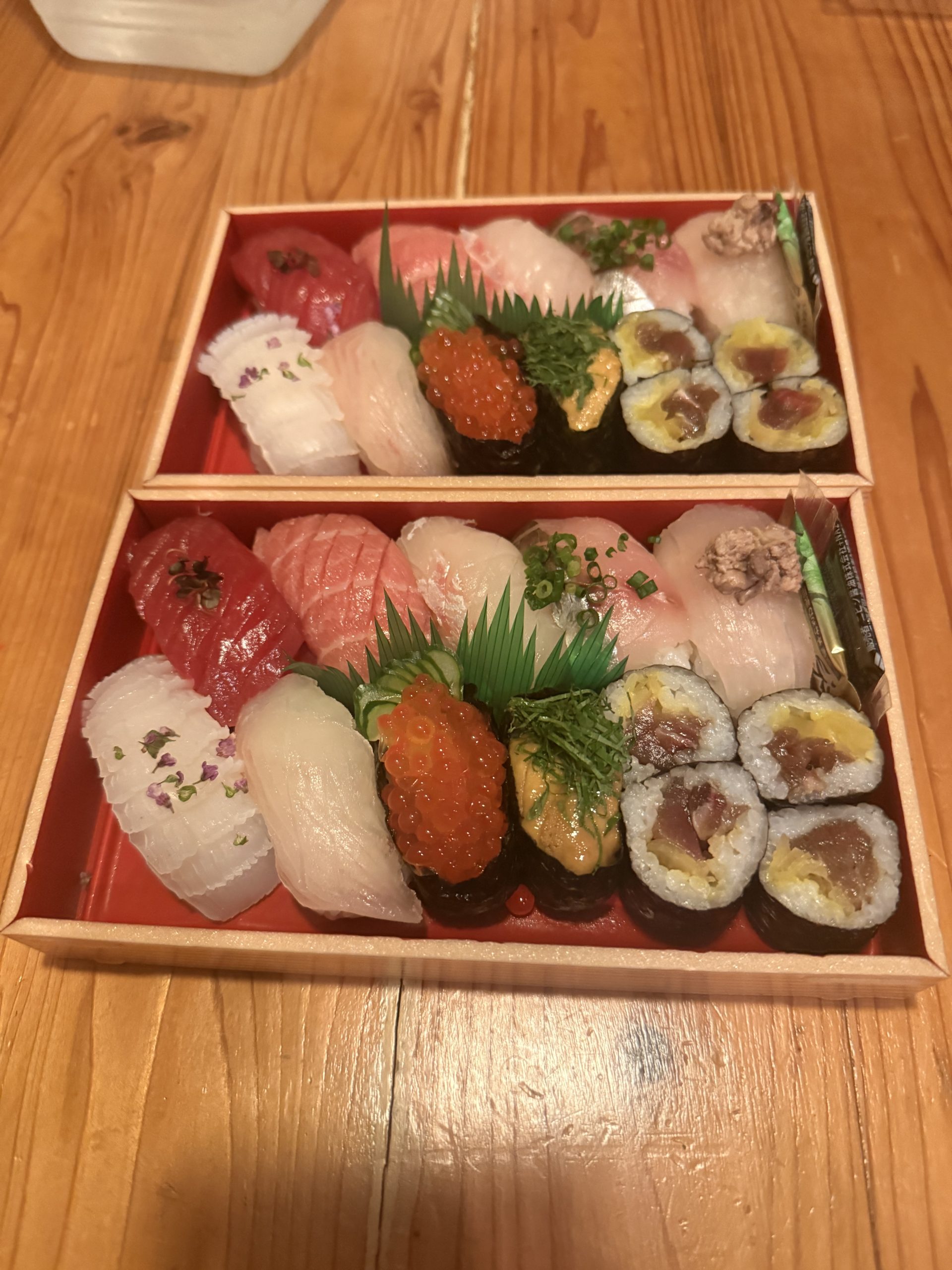 「今日のつぶやき」明日からまた仙台へ出張。10月20日から始まる『三陸・常磐 食べて応援!うめぇもんフェア」のアイテム探しに行ってきます!もう殆どは決まってるんですが、展示会があるのでこれがラストチャンスです。前回はお店のチーフ数名と一緒に行きましたが今回はボッチです…。気乗りしませんが仕方ない…。次回は木曜日にお願いします😌。そうそう!昨日、松山三越で念願のあら坊のスペシャル握り寿司を買って帰りました!いつも画像をインスタにUPする係だったので、送られてきた画像を見てヨダレを…いや、食べてみたいと思ってました。いやー、クオリティ高杉でしょ!画像貼り付けておきますw