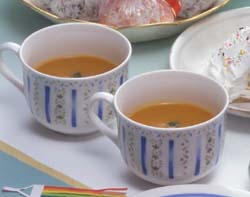(冷凍かぼちゃ500g、ごはん大さじ3、水4カップ、スープの素2個)●牛乳2カップ●マーガリン大さじ2●塩・こしょう各少々